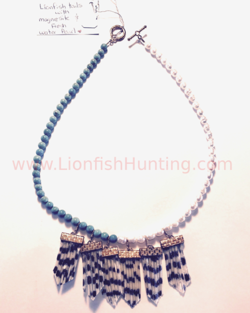 $85.00Beautiful handcrafted lionfish necklace made with turquoise magnesite, freshwater pearls, and non-venomous lionfish tails. This amazing piece features 5 sets of tails in a stunning design. Lovingly handcrafted in Belize by the artisan Kaj, this piece will show your support for helping to reduce the invasive lionfish population by growing alternative markets for lionfish spines. Save the reef, wear lionfish jewelry! -